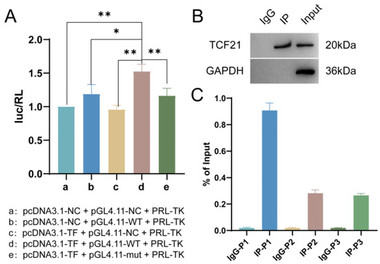 The presence of direct interaction between TCF21 and Notch4. (A) Dual-luciferase reporter assay. (B) CHIP assay. (C) CHIP-qPCR assay. Note: * p < 0.05 represents a statistical difference, ** p < 0.01 represents a significant statistical difference.