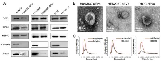 Characterizations of sEVs. (A) Western blot of different cells and their derived sEVs. (B) TEM images of sEVs showing sizes in a dimension of ~100 nm with a spherical or characteristic cup-like morphology. The scale bar indicates 100 nm. (C) Particle size distribution of sEVs detected by NTA, showing a peak size at ~130 nm.