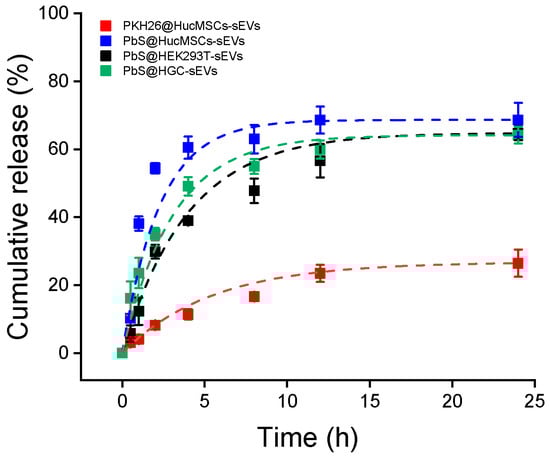 The dye release experiments were conducted in PBS solutions and results were shown in Figure 2. Clearly, PbS@sEVs demonstrated an initial burst of PbS release, where the cumulative release exceeded the half payload in the first 2 h. Since then, the releasing rate slowed down until the releasing plateau was reached. By fitting the data into a release kinetics function , where a stands for the maximal release percentage and k denotes the releasing rate, the values of a = 66.9% and k = 0.704 h−1 (R2 = 0.97) were obtained for the PbS@HucMSCs-sEVs releasing profile. In contrast, the PKH26@HucMSCs-sEVs displayed a sluggish unleashing of PKH26, and the fitting into the same function of release kinetics showed a = 27.4% and k = 0.141 h−1 (R2 = 0.99) for the PKH26@HucMSCs-sEVs releasing profile, confirming a significantly reduced releasing rate and a lessened releasing percentage in the timeframe examined up to 24 h (Table 1).