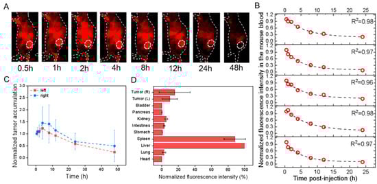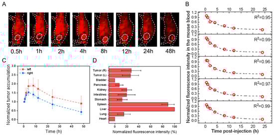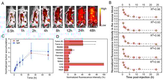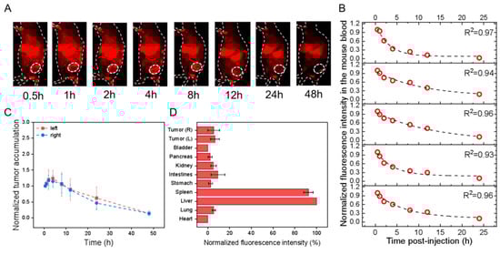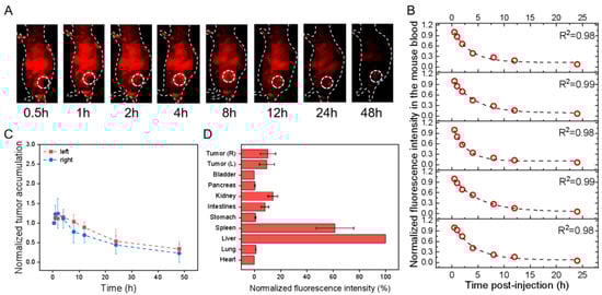 In vivo profiles of PbS@HEK293T-sEVs in HGC-27 cell-transplanted subcutaneous tumor models after tail-vein injection. All fluorescence images were taken upon excitation = 808 nm and emission > 1000 nm. (A) Overlaid bright-field and fluorescence images of one representative mouse image with the tumor region monitored (dotted circle; only right flank shown) at different time points as indicated. (B) The fluorescence intensity of mouse blood was plotted versus different times p.i., which was fitted to an exponential function (indicated by the dashed line in each figure panel), so that the obtained exponential decay constant was converted into the circulation half-life time (t1/2) in the blood. (C) The fluorescence intensities of the left (red) and right (blue) tumors in the mice were monitored and plotted as a function of time (connected by dotted lines). Each fluorescence intensity at one specific time was normalized to that at the first time point and plotted versus time. (D) The mice were sacrificed at 48 h p.i., and the fluorescence intensities were examined for ex vivo organs as indicated with each normalized to that of liver uptake, showing the relative fluorescence distribution in major organs.