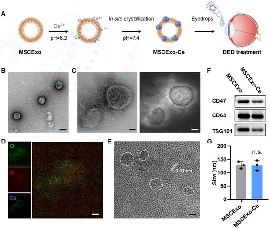 Preparation and characterizations of in situ cerium oxide crystallized mesenchymal stem cell exosomes (MSCExo-Ce). (A) Schematic for the fabrication of MSCExo-Ce. Exosomes were incubated in saline at 37 °C with 1 mM of Ce3+ for 1 h and then ultra-filtrated to remove excess Ce3+. Cerium oxide crystals were crystalized on the Exo membrane upon pH adjustment to 7.4. The fabricated MSCExo-Ce was preserved as the eyedrops formulation for DES treatment. (B) TEM imaging of MSCExo-Ce stained with uranyl acetate. The scale bar is 100 nm. (C) High-resolution TEM (HR-TEM) imaging of MSCExo-Ce (left) and the corresponding dark field imaging (right). The scale bar is 20 nm. (D) Elemental mapping imaging of MSCExo-Ce. The scale bar is 20 nm. (E) HR-TEM imaging of MSCExo-Ce, with the lattice spacing being indicated by the white line. White circles indicate cerium oxide nanocrystals. The scale bar is 2 nm. (F) Western blotting analysis of MSCExo-Ce. CD47, CD63, and TSG101 are classical markers for exosomes. (G) Size distribution of MSC-Exo and MSCExo-Ce (n = 3 biologically independent samples). The data in G are presented as the means ± SD and are assessed by a two-tailed unpaired Student’s t-test (n.s.: not significant).