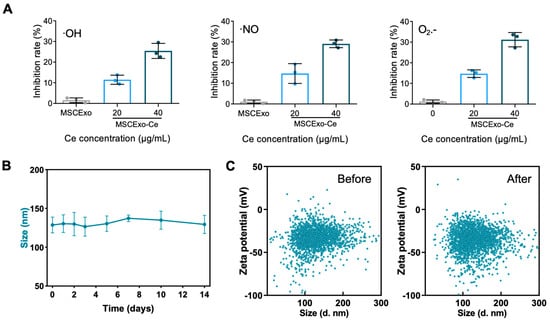 After obtained the MSCExo-Ce, we first investigated their ROS scavenging capabilities. Commercial detection kits were employed to measure the ROS scavenging ability. As predicted, MSCExo-Ce demonstrated superior scavenging capacity for hydroxyl radicals, nitrogen free radicals, and superoxide anions compared with naïve exosomes, which is due to the ultrasmall nanocrystals on the MSC membranes (Figure 2A). Furthermore, a 14-day observation of MSCExo-Ce size distribution in PBS was conducted to confirm its stability. No notable size changes were observed during storage in saline at 4 °C (Figure 2B). Similarly, no significant shifts in the particle size or zeta potential were detected before or after lyophilization/rehydration cycles (Figure 2C). These findings indicate that MSCExo-Ce possesses excellent ROS scavenging ability and storage stability.