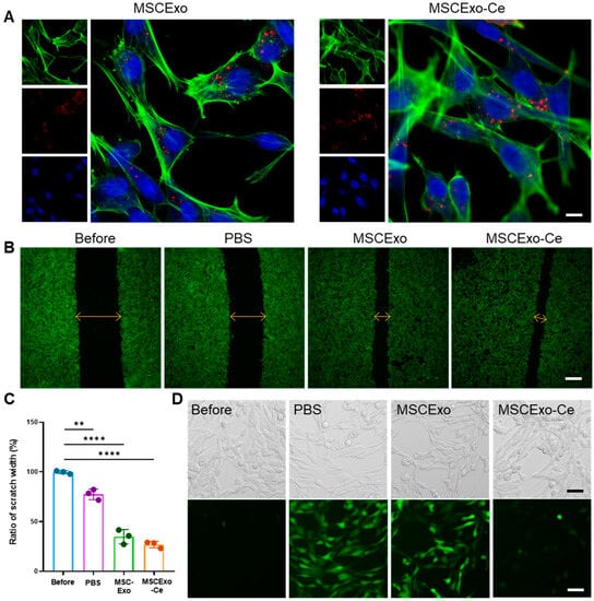 HCECs were seeded into 24-well plates at a density of 2.5 × 105 cells per well and were cultured overnight. Subsequently, a sterile 10 μL pipette tip was utilized to create a scratch on the cell monolayer, which was then washed twice using phosphate buffer saline (PBS) to eliminate any detached cells. Following this step, the cells were treated using various drugs, including PBS, MSCExo (100 μg/mL), and MSCExo-Ce (100 μg/mL), in fresh medium, and the cells were co-incubated for a period of 12 h. The cell cytoskeleton was stained using FITC-conjugated phalloidin (Beijing Solarbio Science & Technology, Beijing, China), and confocal laser scanning microscopy (CLSM) (Leica, Wetzlar, Germany) was employed to capture images of the scratched area.