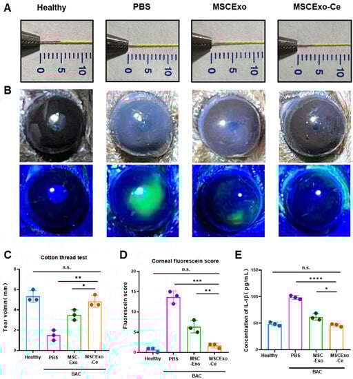 MSCExo-Ce suppresses DES in BAC-induced mice. (A) Cotton thread measurement of the wetting length. The normal mice are the healthy group, the BAC-induced mice treated with PBS are the PBS group, the BAC-induced mice treated with MSCExo (100 μg/mL) are the MSCExo group, and the BAC-induced mice treated with MSCExo-Ce (100 μg/mL) are the MSCExo-Ce group. (B) Slit lamp and fluorescein staining showing the representative ocular changes of BAC-induced mice in each group after treatment with PBS, MSC-Exo, and MSCExo-Ce. (C) Quantitative analysis of the wetting length in (A). (D) Mean staining score of the eye surface in (B). (E) ELISA measurement of inflammatory cytokines IL-1β in murine tears. The data in (C–E) are presented as the means ± SD and are assessed via a one-way ANOVA test. **** p < 0.0001; *** p < 0.001; ** p < 0.01; * p < 0.05; n.s. means not significant.