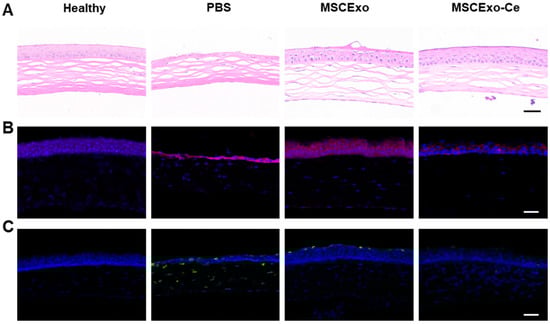 Histological manifestations of MSCExo-Ce in treating DES in BAC-induced mice. (A) Representative H&E staining images of the cornea after the different treatments with PBS, MSCExo, and MSCExo-Ce. The scale bar is 100 μm. (B) Evaluations of oxidative stress (ROS) by immunostaining on the corneal epithelial cells in the mice eyes after diverse therapies for DES. Red: dihydroethidium as the probe of ROS. The scale bar is 100 μm. (C) Apoptosis by TUNEL immunostaining on the corneal epithelial cells in the mice eyes after diverse therapies for DES. Green: FITC–dUTP. The scale bar is 100 μm.
