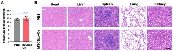 Safety profiles of MSCExo-Ce. (A) Measurement of the intraocular pressure using Goldmann applanation tonometry for the assessment of local responses to MSCExo-Ce. (n = 3 eyes). (B) Major organ (heart, liver, spleen, lung, and kidney) sections stained with hematoxylin and eosin (H&E) were analyzed for the systemic toxicity evaluation. The scale bar is 100 μm. Data in (A) are presented as the means ± SD and were assessed using a two-tailed unpaired Student’s t-test (n.s.: not significant).