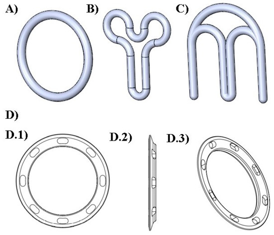 Digital designs of the different geometries of VRs produced. (A) traditional; (B) “Y”; (C) “M” (D) flat circle; views of the flat circle design: (D.1) front, (D.2) left side, and (D.3) perspective.
