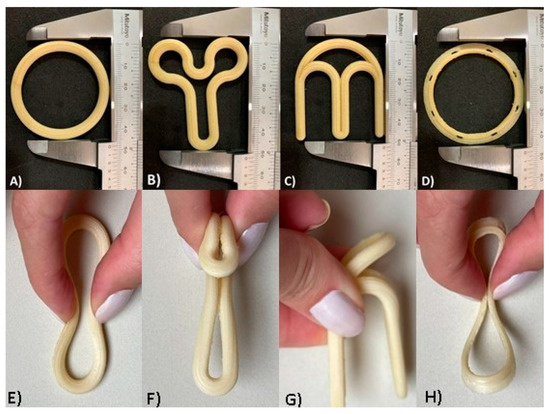 Optical images of the different VR designs produced by FDM technology with PVA filament: (A) design traditional; (B) design “Y”; (C) design “M”; (D) design flat circle. The VRs were folded as they would be for vaginal insertion: (E) traditional design folded; (F) “Y” design folded; (G) “M” design folded; (H) flat circle design folded.