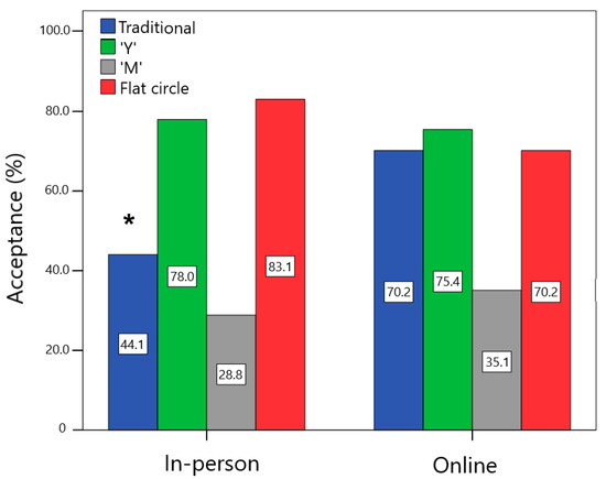 Comparison of the percentage of acceptance (women who would use or would definitely use each device) among the in-person and online users. * Statistically significant difference between groups, p < 0.05.