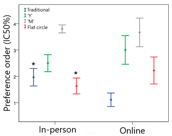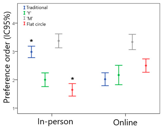 Figure 4 illustrates the preference order of the end users for the different VR designs in the in-person and online groups. For the in-person sample, the flat circle device was preferred, followed by designs “Y” > traditional > “M”. A slightly different result was found for the online sample, in which the traditional design was the one that women liked the most, followed by designs “Y” > flat circle > “M”. In the comparison between the groups, the traditional design was less preferred by the in-person group than by the online group (Z = −5.480; p < 0.001). On the other hand, the in-person group declared a greater preference for the flat circle device compared to the online group (Z = −4.896; p < 0.001).