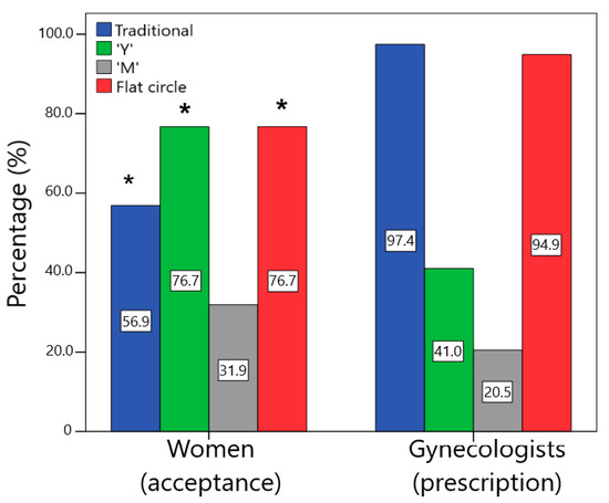 Comparison of the percentage of acceptance (would use or would definitely use) by the women and the prescription (would prescribe or would definitely prescribe) by the gynecologists for the different designs (* statistically significant difference between groups, p < 0.05).