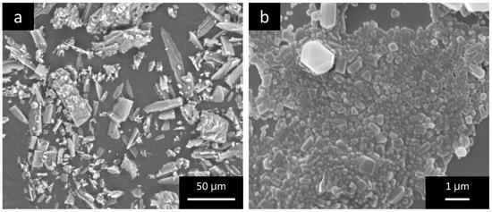 As shown in Table 1, examination of colloidal properties with DLS showed an average nanocrystal diameter of around 230 nm, with a polydispersity index (PDI) of 0.16, indicating a narrow size distribution. As for Zeta potential measurements, the sample revealed a substantially negative value (−38 mV), indicative of good nanosuspension stability. Characterization data are in agreement with our previous study, where the stability of the system was also proved with DLS analysis after 90 days of storage [8]. As a part of the quality control of the production, the morphology of DCF-NS was also assessed using SEM, that allowed us to evaluate the shape of the crystals and the possible variations induced by the nanosizing process.