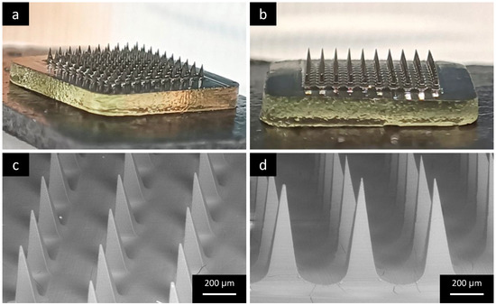 As can be seen in the macroscopic images (Figure 3a,b), MNAs were formed correctly and 100 microneedles arranged in a 10 × 10 matrix were obtained from each mold, with the shape of each microneedle clearly visible. To further investigate their structure, the samples were visualized using SEM under variable pressure conditions. Both the samples with the needle’s length of 500 and 800 µm (Figure 3c,d, respectively) showed a linear disposition of the needles, with a regular pyramidal shape and sharp extremities.