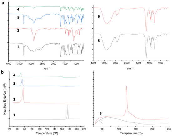 ATR-FTIR spectra (a) and DSC thermograms (b) of (1) DCF, (2) P188, (3) DCF/P188 PM, (4) DCF-NS, (5) empty Disks and (6) DCF-NS-Disks. DSC thermogram of (5) empty Disks and (6) DCF-NS-Disks.