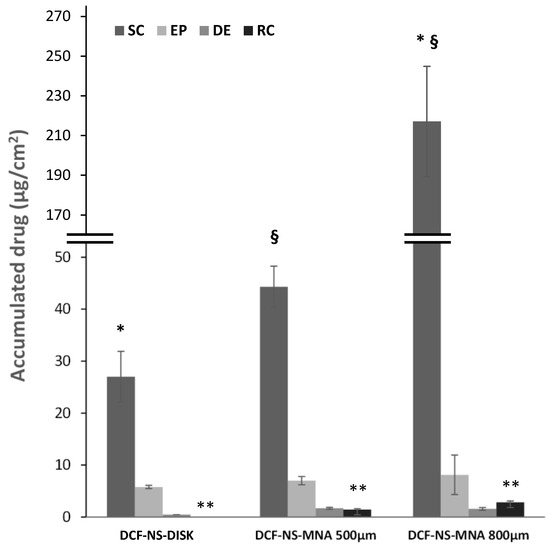 Cumulative amount of DCF retained into and permeated through newborn pig skin layers after 8 h application of microneedle arrays loaded with DCF-NS with needle length of 500 µm (DCF-NS-MNAs 500 µm), 800 µm (DCF-NS-MNAs 800 µm) or DCF-NS-Disks. SC—stratum corneum; EP—epidermis; D—dermis; RC—receptor compartment. Same symbols indicate couple of values that are statistically different (p < 0.01).