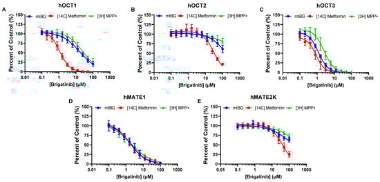 Dose-dependent inhibition of hOCT1-3 and hMATE1/2-K by brigatinib using mIBG, metformin, and 1-methyl-4-phenylpyridinium (MPP+) as substrates. Uptake of 1 µM mIBG, 8.9 µM [14C]metformin, and 1 µM [3H] MPP+ in the absence and presence of brigatinib was measured in vector, hOCT1 (A), hOCT2 (B), hOCT3 (C), hMATE1 (D), and hMATE2-K (E) expressing HEK293 cells after 2 min of incubation at 37 °C. The uptake of substrate mediated specifically by transporters was calculated by subtracting the amount of substrate (measured in pmol per mg of total protein) in mock cells from the amount of substrate measured in transporter-transfected cells. Data are expressed as means ± SD from three independent experiments as a percentage of substrate uptake without brigatinib (control).