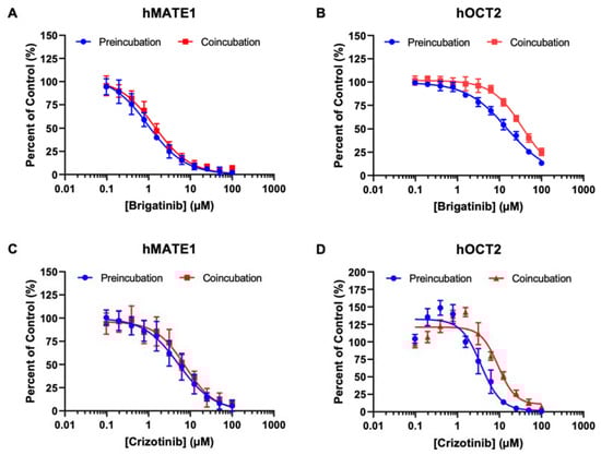 Time-dependent inhibition has been observed previously with OATP1B1 and 3 [40,41]. Clinically, an inhibitor or perpetrator may be administered for an extended period to attain steady-state concentrations in the system before a substrate (i.e., the victim drug) is given [54]. Therefore, there may be an underestimation of the inhibitory potential of test compounds in in vitro transporter assays if the substrate and the inhibitor are coincubated, which only allows simultaneous and direct interaction at the substrate binding site. For renal transporters, this is especially important, since they represent a major pathway for systemic drug elimination [27]. Our data show that preincubation of brigatinib or crizotinib had a minimal effect on their inhibition potencies for hMATE1 (Figure 4 and Table 4). Nonetheless, preincubation appears to trend towards a more potent effect for hOCT2. Further in-depth studies are needed to elucidate the impact of preincubation on inhibition potencies for pOCTs.