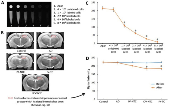 Figure 1. In vitro and in vivo MRI evaluation. (A) Coronal and transverse MRI images from microtubes containing different concentrations of SPION-labeled cells under 1.5-Tesla. (B) Coronal T2 Weighted Turbo Spin Echo (T2W-TSE) sequence from the rat brain of different groups after cell treatment using 3-Tesla MRI scanner. (C) Signal intensity diagram of MRI images (* p ≤ 0.05 compared with agar and unlabeled cells). (D) Signal intensity of the hippocampus region in MRI images in different groups before and after cell treatment. (* p ≤ 0.05 compared with control and AD). Control: Wild-type (WT) rat group; AD: AD model group; IV-NTC: AD rats treated intravenously (IV) with non-targeted cells; IV-TC: AD rats treated IV with targeted cells; ICV-NTC: AD rats treated with intracerebroventricular (ICV) non-targeted cells. (Adapted with permission from [71]. Copyright © 2023, Elsevier, Amsterdam, The Netherlands).