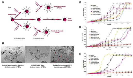 Figure 2. (A) Scheme of SPION preparation with single- and double-negative or positive dextran coatings. (B) Transmission electron microscopy (TEM) images of Aβ fibrils with double-layer negative, plain, and positive dextran-coated SPIONs at two different magnifications. (Adapted with permission from [72]. Copyright © 2023, American Chemical Society, Washington, DC, USA). Influence of magnetic field application in the kinetics of Aβ aggregation with negative, positive, and plain PEG-coated SPIONs at different concentrations including (C) 40 μg/mL, (D) 80 μg/mL, and (E) 100 μg/mL (Adapted with permission from [73]. Copyright © 2023, Elsevier, Amsterdam, The Netherlands).