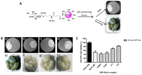 Dextran is a polysaccharide with excellent biocompatibility that is soluble in water, and its coating onto SPION surfaces has a significant impact on their physicochemical properties. Dextran-coated SPIONs were first described in 1982 by in situ technology and approved by the FDA in 1996 (Feridex®) [87]. Dextran and its modifications were used in the study of brain diseases. A combination of dextran sulfate-coated SPIONs and quercetin was shown to be less toxic to PC12, a cell line that rapidly and reversibly responds to nerve growth factor (NGF) [88], than dimercaptosuccinic acid (DMSA)-coated SPIONs. In detail, dextran sulfate-coated SPIONs in a concentration lesser than 50 µg/mL had no significant toxicity to PC12 cells, while 1.5 mM of DMSA-modified SPIONs was shown to be toxic to those cells [89]. In Kouyoumdjian et al. [90] study, dextran coats the external surface of SPIONs, forming a stable colloidal suspension, and after modification with a sialic acid methyl ester derivative, the glyconanoparticles (NP-Sia) were purposed for the detection of Aβ plaques through MRI and Prussian blue staining (Figure 3A). The superparamagnetic nature of NP-Sia enabled the ex vivo detection of amyloid plaques by MRI, where dark spots were observed on the surface of Aβ brains incubated with the glyconanoparticles (Figure 3B(a)). Prussian blue staining was used to support the MRI results, where the presence of a blue color indicates the areas bearing iron oxide NP. This staining showed that only Aβ brains treated with NP-Sia exhibited the characteristic blue color (Figure 3B(e)), corroborating the MRI detection. Both dark spots and the blue color disappeared along the following conditions since free sialic acid was added during incubation to compete with NP-Sia binding (Figure 3B(b,f), respectively). Also, Aβ brains without NP incubation or normal mouse brains incubated with NP-Sia were used as controls to show that NP-Sia were able to bind specifically to Aβ (Figure 3B(c,d,g,h)). Moreover, NP-Sia converted Aβ to its less toxic form and ensured the protection of SH-SY5Y neuroblastoma cells from Aβ-induced cytotoxicity (Figure 3C).