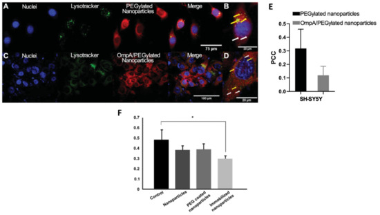 Figure 4. (AD) Confocal microscopy images of endosomal escape of PEGylated- and OmpA/PEGylated-SPIONs in SH-SY5Y cells. (E) Pearson’s correlation coefficient (PCC), for both PEGylated-and OmpA/PEGylated-SPIONs in SH-SY5Y cells, indicates endosomal escape increase in case of particles conjugated with the translocator molecule OmpA. (F) Relative BACE1 expression in different treatment conditions. (* p ≤ 0.05 compared with control). (Adapted with permission from [99]. Copyright © 2023, Taylor & Francis Ltd., London, UK).