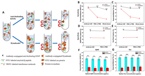 Figure 5. (A) Schematic illustration of immunomagnetic separation of Aβ and tau proteins in CSF or serum by antibody-conjugated antibiofouling SPIONs or Dynabeads®. Sensitivity comparison between SPIONs and Dynabeads® on Aβ40 (B) and tau (C) proteins separation. Specificity of SPIONs and Dynabeads® on separation of Aβ40 (D) and tau (E) proteins. Separation of Aβ40 (F) and tau (G) proteins from human blood with the different magnetic separating agents. (* p < 0.05, ** p < 0.01, *** p < 0.001) (Adapted with permission from [100]. Copyright © 2023, American Chemical Society, Washington, DC, USA).