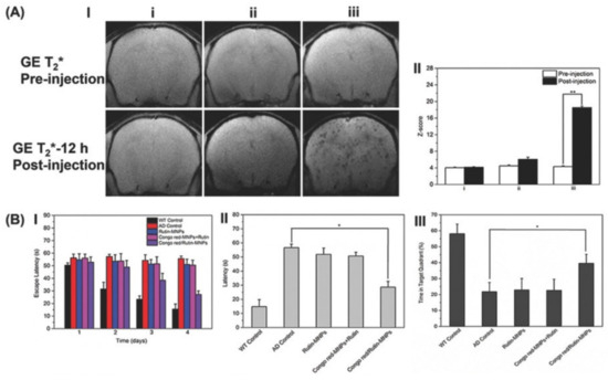 Figure 6. (A-I) In vivo MRI representation of brains in WT mice before and after injection of Congo red/Rutin-MNPs (i) and AD mice before and after injection of Rutin-MNPs (ii) and Congo red/Rutin-MNPs (iii). (A-II) Z-scores from the MRI data among WT mice before and after injection of Congo red/Rutin-MNPs (i) and AD mice before and after injection of Rutin-MNPs (ii) and Congo red/Rutin-MNPs (iii). GE: gradient-echo, a type of pulse sequence during image acquisition. (B) Escape latencies (B-I) and latency during the memory test in Morris water maze (MWM) probe trial without a platform (B-II). Time in the target quadrant in MWM probe trial with a platform (B-III). All tests were performed in WT control mice, AD control mice, and AD mice treated with Rutin-MNPs, Congo red-MNPs + Rutin, and Congo red/Rutin-MNPs. (* p < 0.05, ** p < 0.01). (Adapted with permission from [107]. Copyright © 2023, John Wiley and Sons, Hoboken, NJ, USA).