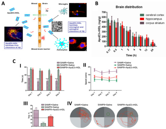 Figure 7. (A) Schematic representation of ApoE3–rHDL action for Aβ clearance from microglia and astroglia after BBB permeation. (B) Brain distribution of 125I-ApoE3–rHDL after intravenous administration. (C) ApoE3–rHDL rescued memory deficits in SAMP8 mice. (I) Escape latency, (II) swimming speed, (III) time spent in the quadrant where the escape platform is located, and (IV) representative swimming path. (* p < 0.05, ** p < 0.01, *** p < 0.001 significantly different with those of the saline treated SAMP8 mice.) (Adapted with permission from [136] Copyright © 2023, American Chemical Society, Washington, DC, USA).