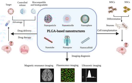 PLGA carriers have strong advantages in drug delivery. They can control the release of drugs, thereby prolonging their half-life and improving their bioavailability [14]. Drugs or bioactive ingredients can be targeted for absorption and prevent adverse reactions by crossing the BBB with PLGA carriers [15]. When used in conjunction with the targeted fragment, this method can precisely direct treatment to the site of a lesion in the brain [9]. PLGA scaffolds play a crucial role in cell transplantation [16], nerve regeneration [17], and tissue repair [18]. Ischemic stroke can be diagnosed and evaluated with greater precision when PLGA-based nanostructures are combined with staining markers or magnetic particles to allow for real-time tracking while imaging equipment observes [19]. In addition, the study of PLGA in gene therapy [20] and basic research [21] has also been reported. Nevertheless, there are few reviews on the application to PLGA nanostructures in ischemic stroke. This review will focus on this topic from an interdisciplinary perspective (Figure 1).