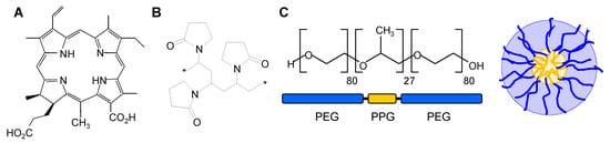 (A) Structure of the photosensitizer chlorin e4 (Ce4); (B) building block of the polymeric network formed by polyvinylpyrrolidone (PVP, MWav 10 kDa), *: repeated building blocks [ ]n; (C) polyethylene glycol (PEG)—polypropylene glycol (PPG) triblock copolymer PEG-PPG-PEG Kolliphor P 188 (KP) and a sketch of a KP-micelle.