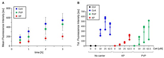 In the absence of carriers, a fluorescence drop was observed at the highest Ce4 level (62.5 μM). At this concentration, chlorin aggregation becomes prevalent, leading to pronounced fluorescence quenching [31] so that the measured fluorescence intensity no longer correlates with the actual intracellular Ce4 concentration. In contrast, these aggregation and quenching effects are prevented through the encapsulation of Ce4 into PVP or KP, where it exists in the monomeric state [31].