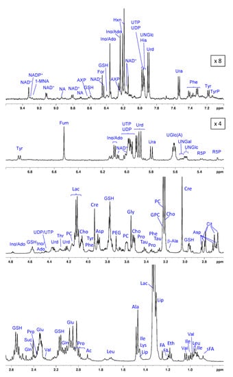 1H high-resolution magic angle spinning NMR summed spectrum (T2-filtered) of lysed HeLa cell suspension in phosphate-buffered saline with resonance assignments. Spectral regions of 5.2–7.0 ppm and 7.0–9.6 ppm were scaled up by a factor of 4 and 8, respectively. Ac: acetate; Ala: alanine; β-Ala: β-alanine; Asp: aspartate; AXP: adenosine phosphate; Cho: choline; Cit: citrate; Cre: creatine; Eth: ethanol; FA: fatty acids; For: formic acid; Fum: fumarate; Gln: glutamine; Glu: glutamate; Gly: glycine; GPC: glycerophosphocholine; GSH: glutathione; His: histidine; Hxn: hypoxanthine; Ile: isoleucine; Ino/Ado: inosine/adenosine; Lac: lactate; Leu: leucine; Lip: lipids; Lys: lysine; 1-MNA: 1-Methylnicotinamide; NA: nicotinamide; PC: phosphocholine; PEG: polyethylene glycol; Phe: phenylalanine; Pro: proline; R5P: ribose-5-phosphate; sFA: fatty acids (saturated); Suc: succinate; Tau: taurine; Thr: threonine; Tyr: tyrosine; TyrP: tyrosine-containing peptide; UDP: uridine diphosphate; UGlc(A): UDP-glucose/UDP-glucuronic acid; UNGal: UDP-N-acetyl-galactosamine; UNGlc: UDP-N-acetyl-glucosamine; Ura: uracil; Urd: uridine; UTP: uridine triphosphate; Val: valine.