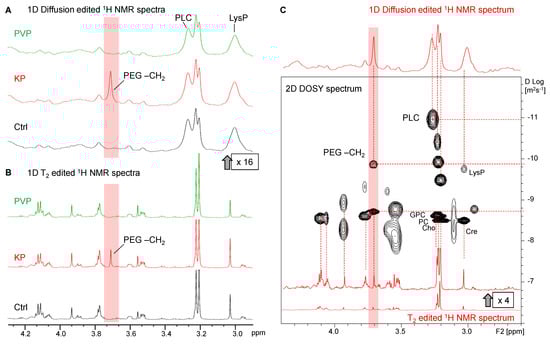 (A) HR-MAS 1H 1D diffusion-edited NMR spectra (scaled up by a factor of 16) and (B) HR-MAS 1H-T2-edited (PROJECT) NMR spectra of lysed HeLa cell suspensions in phosphate-buffered saline (PBS). Cells incubated with PBS as controls (Ctrl, black), Kolliphor P188 (KP, red), and polyvinylpyrrolidone (PVP, green). The polyethylene glycol (PEG)-CH2 resonance was only visible in cells incubated with KP and is highlighted in red. (C) HR-MAS 1H 2D DOSY spectrum of a cell suspension incubated with KP; 1D diffusion- and 1D T2-edited projections are shown in red. The PEG-CH2 resonance corresponds to a slow and a fast diffusing component (highlighted in red). Cho: choline; Cre: creatine; GPC: glycerophosphocholine; LysP: lysine-containing peptide; PC: phosphocholine; PEG: polyethylene glycol; PLC: phosphatidylcholine.