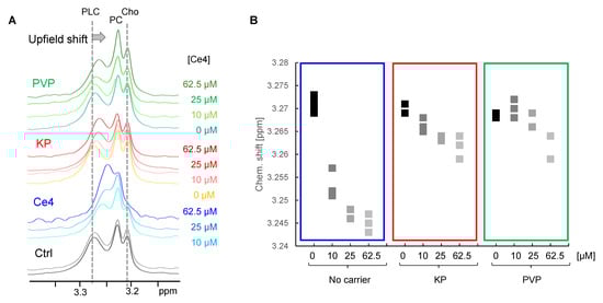 In the current study, such an induced chemical shift change could be observed in the diffusion-edited spectra of cells incubated with Ce4. Whereas the Cho and PC resonances remained unchanged, a clear upfield shift of the PLC N-methyl choline resonance appeared. This upfield shift correlated with Ce4 concentration and was also detectable when Ce4 was applied with KP and PVP, but to a lower extent (Figure 5A,B). This Ce4 ring current-induced shift reflects a direct interaction with cellular phospholipids, suggesting Ce4 association with phospholipid membranes. This is in agreement with the assumption that cellular membranes are the preferential intracellular localization sites of porphyrinic PSs [71,72]. Our previous model studies on externally added amphiphilic Ce6 derivatives to unilamellar phospholipid vesicles as model membranes have suggested a preferential association with the choline-containing head group regions of the phospholipids [61,73,74]. Therefore, the current approach provides the unique possibility to localize intracellular porphyrin not just on a molecular but even atomic level.