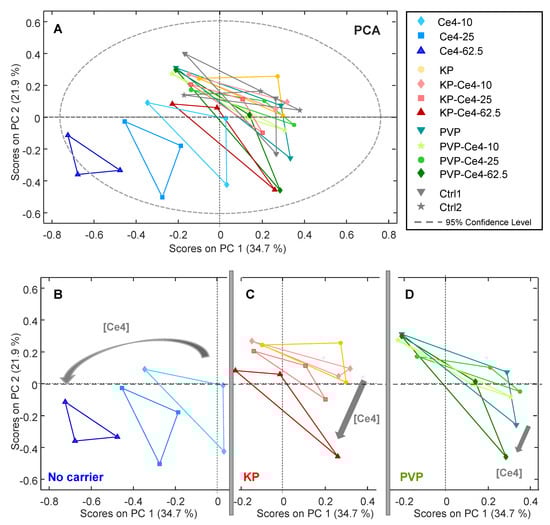 In the first step, unsupervised PCA was applied to all samples to make potential clustering of sample classes visible and to probe for outliers. In Figure 6A, the PCA scores plot is displayed for the first two components, PC-1 and PC-2, accounting for a total variance of 56.6%. While the samples incubated with Ce4 without carrier, shown in blue, were well-separated in the lower quarter of the plot with negative PC-1 and PC-2 scores, the remaining samples overlapped. For the carrier-free samples, there was a Ce4-concentration-dependent shift towards increasingly negative scores along PC-1. A correlation with Ce4 concentration, even though less pronounced, was also observed for the samples with KP and PVP. To make this correlation more visible, the corresponding subgroups are shown separately as excerpts of the common plot shown in Figure 6A (Figure 6B–D). These results indicate that Ce4 triggers a concentration-dependent metabolic response in HeLa cells with different characteristics provided by its form of application, i.e., free or carrier-associated. Notably, in the PCA scores plot, the data points from each of the triplicates possessed a triangular arrangement. This was caused by the associated batches for each sample within a triplicate (a, b, or c) of independently prepared HeLa cells (see Experimental Section 2.6). Accordingly, within each batch, the samples cluster and there is a difference in the metabolic profile between these clusters, mainly along PC-2 (Figure S6A). The loading plot for PC-1 and PC-2 (Figure S6B) reveals that the contributions derive from a few specific metabolites, mainly PC and Lac. This underlying difference can be explained by the variability inherent to independent biological samples causing systematic inter-batch variations sometimes encountered in metabolomic studies and referred to as “batch effect” in the literature [75]. However, despite these batch-dependent differences, a clear clustering of sample classes for each condition (Ce4 concentration and carrier material) superimposed the background variations. Therefore, this unsupervised PCA approach already reveals the presence of class-dependent metabolic alterations without the need for any background subtraction.