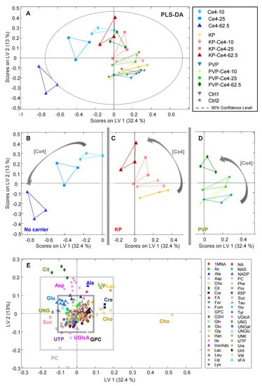 Again, to disentangle the formulation-related subgroups, the corresponding parts of the PLS-DA plot were extracted and shown separately in Figure 7B–D for better visibility of intra-group distributions. These excerpts clarify the correlation with Ce4 concentration within each sub-group that mainly impacted LV-2 scores. Both for KP (Figure 7C) and PVP (Figure 7D), the LV-2 scores move from negative toward increasingly positive values with Ce4 concentration, whereas the trend turns in the opposite direction for carrier-free samples (Figure 7B). In Figure 7E, the two-dimensional loading plot for LV-1 and LV-2 is shown. For classifying the impact of metabolite contributions to the PLS-DA model (Figure 7A) according to their magnitude, two squares (light and dark gray) were overlaid, marking the arbitrarily selected load values of ±0.1 and ±0.2 along both dimensions (Figure 7E). According to this scale, Cho, PC, and Cit have the largest impact on separating the sample classes with load values outside the “±0.2-square”. This indicates that Cho levels are inversely correlated with the concentration of free Ce4 (main contribution along LV-1) and Cit levels are correlated with concentration of carrier-associated Ce4 or moderately increased free Ce4, respectively, whereas PC levels decrease (main contributors along LV-2). The potential meaning of these metabolic changes will be further discussed in the subsequent sections.