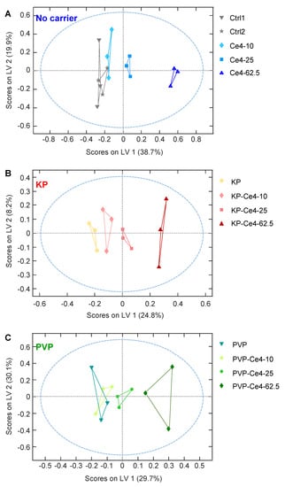 Orthogonal partial least squares (oPLS) analysis applied to samples and buckets from 1D PROJECT spectra as an X-matrix and chlorin e4 (Ce4) concentration (0, 10, 25, 62.5 μM) as a Y-matrix according to subclasses of (A) samples without carriers (259 × 15); (B) samples with Kolliphor P188 (KP) as a carrier (259 × 12); (C) samples with polyvinylpyrrolidone (PVP) as a carrier (259 × 12). The blue dashed line includes samples falling into the range of 95% confidence level. Model statistics: (A) R2 0.99; Q2 0.93; (B) R2 0.97; Q2 0.67; (C) R2 0.94; Q2 0.71.