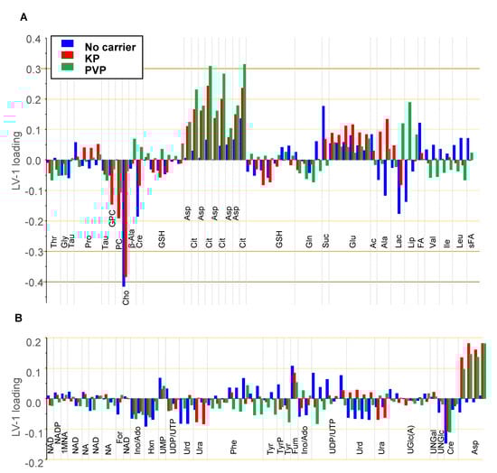 Loadings of the first oPLS components (LV-1) according to the oPLS score plots shown in Figure 8 for carrier-free samples (blue), Kolliphor P188 (KP) samples (red), and polyvinylpyrrolidone (PVP) samples (green). Loadings are shown for buckets that could be assigned to metabolites and that had little overlap. Horizontal arbitrary lines mark metabolites with respect to their contribution with load values above ±0.1, ±0.2, ±0.3, and ±0.4. (A) 3.6–0.8 ppm region; (B) 9.4–3.6 ppm region. Ac: acetate; Ala: alanine; β-Ala: β-alanine; Asp: aspartate; Cho: choline; Cit: citrate; Cre: creatine; FA: fatty acids; For: formic acid; Fum: fumarate; Gln: glutamine; Glu: glutamate; Gly: glycine; GPC: glycerophosphocholine; GSH: glutathione; Hxn: hypoxanthine; Ile: isoleucine; Ino/Ado: inosine/adenosine; Lac: lactate; Leu: leucine; Lip: lipids; 1MNA: 1-Methylnicotinamide; NA: nicotinamide; PC: phosphocholine; Phe: phenylalanine; Pro: proline; sFA: fatty acids (saturated); Suc: succinate; Tau: taurine; Thr: threonine; Tyr: tyrosine; TyrP: tyrosine-containing peptide; UDP: uridine diphosphate; UGlc(A): UDP-glucose/UDP-glucuronic acid; UNGal: UDP-N-acetyl-galactosamine; UNGlc: UDP-N-acetyl-glucosamine; Ura: uracil; Urd: uridine; UTP: uridine triphosphate; Val: valine.