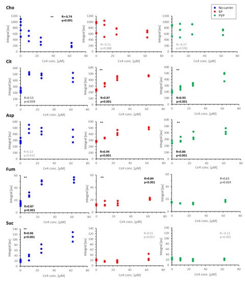 Plots of single metabolite integrals as a function of chlorin e4 (Ce4) concentration applied without carrier (blue), with Kolliphor P188 -micelles (KP, red), and with polyvinylpyrrolidone (PVP, green). Correlation analysis was performed by fitting with resulting R-values and the significance of correlation. Metabolites with highly significant (p < 0.001) Ce4-concentration-dependent levels are marked with **. Cho: choline; Cit: citrate; Asp: aspartate; Fum: fumarate; Suc: succinate.