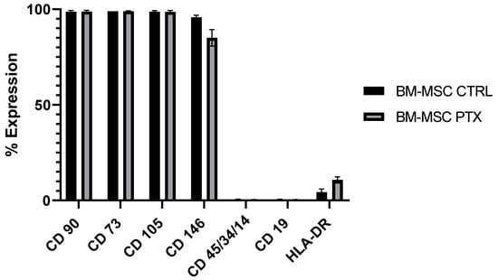 We used three different batches of MSCs isolated from the BM of children who underwent BM collection for sibling transplantation. The characteristics of the donors are reported in Table 1. We verified that the MSC viability remained at > 85% and that the immunophenotype did not change after treatment with 15 µg/mL of PTX for 24 h, as shown in Figure 1. Each BM-MSCs sample was used to produce drug-free secretome (SECR-CTRL) and PTX-loaded secretome (SECR-PTX), respectively, from untreated MSCs and MSCs treated with PTX 15 µg/mL for 24 h.