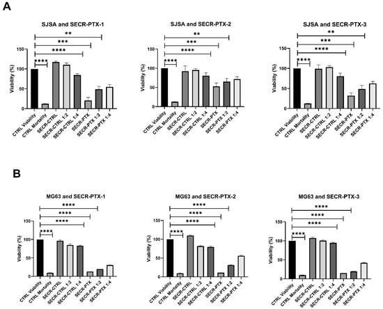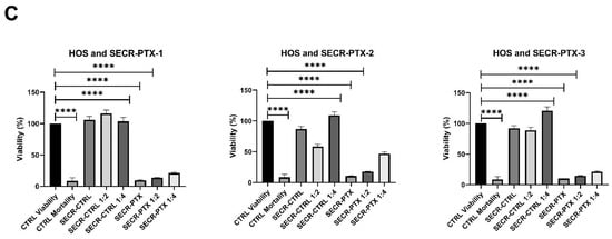 We observed, in all three OS cell lines, that there was a significantly high decrease in viability between untreated cells (control condition—CTRL Viability) and cells treated with 30 µg/mL of PTX (CTRL Mortality), showing a viability of <10% in all OS cell lines. This was also seen with pure SECR-PTX-1-2-3 and with diluted SECR-PTX, showing a dose–response effect. Specifically, we obtained the following mean values with standard deviations in viability: (i) 40.70% ± 16.47 in SJSA, 13.19% ± 2.05 in MG63, 9.55% ± 0.36 in HOS with pure SECR-PTX (p < 0.0001 in all cell lines); (ii) 60.15% ± 9.54 in SJSA (p < 0.0003), 24.28% ± 6.93 in MG63 (p < 0.0001) and 14.49% ± 2.08 in HOS (p < 0.0001). With SECR-PTX diluted to 1:2 (p < 0.0001), the values were 67.13% ± 8.54 in SJSA (p < 0.001), 43.49% ± 13.01 in MG63 (p < 0.0001), and 28.62% ± 14.43 in HOS (p < 0.0001), respectively. Figure 1 shows all the data obtained for each batch (SECR-1,2,3) in triplicate for the SJSA (panel A), MG63 (panel B ), and HOS (panel C).