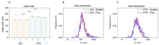 We investigated the contents of the secretome to verify the presence of EVs through an analysis of the three secretome batches (SECR-1, SECR-2, SECR-3), batches without the drug (SECR-CTRL), and after loading with 15 µg/mL of PTX (SECR-PTX), performed in triplicate by NTA. In Figure 2, we report the NTA results in terms of mean size and size distribution, while in Table 3, we show the Z potential and particle concentration. In scatter mode, the NTA was not able to discriminate the nature of the detected nanoparticles (NPs). In order to discriminate whether the NPs detected in the secretomes were EVs or were a mixture of different biological NPs containing EVs but also other species such as protein aggregates, the samples were stained with a fluorescent membrane marker (CellMaskTM Green). Then, the NTA was set to fluorescent mode to exclude the non-stained NPs. Figure 2A,B shows that the size distribution, when measured in scatter mode or in fluorescent mode, did not present significant changes, a good indication that the NPs detected by the NTA were mainly EVs. This does not exclude the presence of other biological species that are not detectable by the NTA, which presents a limit of detection of 30–40 nm.