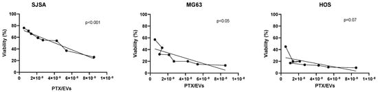 The linear relationship between paclitaxel concentration in EVs (PTX/EVs Tot ng/mL) and viability (%) in three OS cell lines (SJSA, MG63, and HOS), which were treated with three batches of secretome (SECR-1, SECR-2, and SECR-3). The dotted line refers to the quantity of PTX/EVs and the straight line is the trend line.