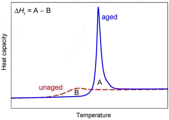 As previously mentioned, amorphous materials, unlike crystals, are in a thermodynamic, non-equilibrium state, and, therefore, such materials undergo the physical ageing process. The process is a physical phenomenon related only to the amorphous solid phase. At a temperature lower than the glass transition temperature, the amorphous materials gradually evolve toward the thermodynamic equilibrium of the glassy state [17]. The aged amorphous material tends to be in a more equilibrium state, with less energy [39,40,41]. The physical ageing process can be studied, among other things, using differential scanning calorimetry [36,42]. On the scan obtained from the standard DSC measurement of an unaged amorphous material, a glass transition with a change in specific heat is observed in the heat flow or heat capacity versus temperature plot (Figure 1). When the amorphous sample is aged isothermally at a temperature lower than the glass transition temperature (called the ageing temperature) and is reheated through the glass transition region, an endothermic peak in the DSC curve is observed in addition to the change of heat capacity (Figure 1).
