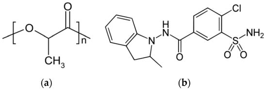 Polylactide (PLA; Figure 2a) is a non-active pharmaceutical ingredient: a biodegradable and biocompatible polymer containing 16.4% of the D-isomer, making it a fully amorphous material [24,25,26,52]. PLA was obtained from Cargill Dow Nature-Works LLC (Blair, NE, USA).