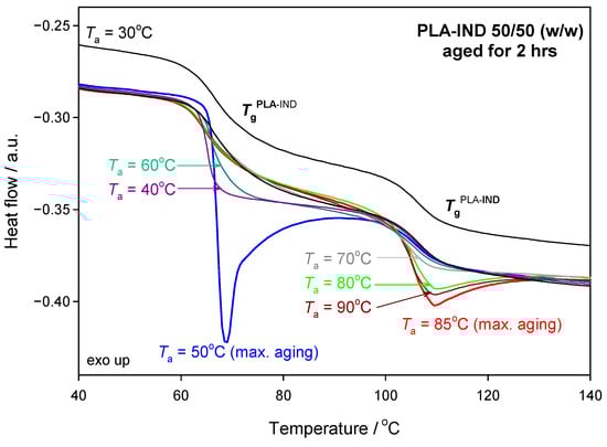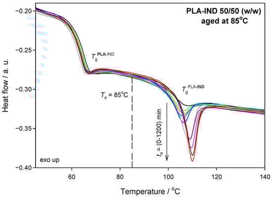 Figure 4 shows a thermogram of PLA–IND 50/50 (w/w) for samples annealed for 2 h at different ageing temperatures below the Tg of IND, i.e., 30, 40, 50, 60, 70, 80, 85 and 90 °C. The annealing at 30 °C did not show any significant changes in enthalpy relaxation in the glass transition region of both the PLA and IND. The changes due to the physical ageing of IND in the PLA–IND system begin to be noticeable for ageing temperature (Ta) at 70 °C and are the highest for Ta = 85 °C. For the annealing at 90 °C, enthalpy relaxation was lower than for 85 °C. This may be due to the fact that, at 90 °C, the material is already at the beginning of the glass transition region. The highest value of the enthalpy relaxation of IND for the PLA–IND 50/50 (w/w) system was observed for the physical ageing process at 85 °C and, therefore, the physical ageing process of the system for longer timescales was carried out at this temperature. It can also be observed that, in the PLA–IND 50/50 (w/w) system, PLA is aged the most at Ta = 50 °C while IND, after 2 h of annealing at this temperature, does not show any change. On the other hand, PLA at 70, 80, 85 and 90 °C is already in its liquid state and thus the physical ageing of the PLA polymer in PLA–IND 50/50 system at this temperature does not occur.