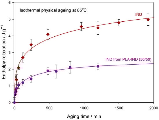 The isothermal and non-isothermal physical ageing processes of IND in a PLA–IND system with a 50/50 mass ratio and pure IND were studied using differential scanning calorimetry. The study demonstrated that the IND and the PLA in the PLA–IND system are immiscible for a mass ratio of 50/50, exhibiting two distinct Tg’s. The presence of PLA in a 50/50 system impacts the kinetics of the physical ageing process of the API.