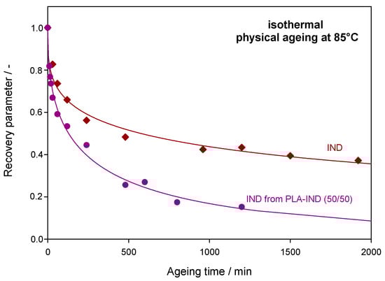 The recovery parameter, , values for IND in the PLA–IND (50/50) system (dots) and for pure IND (squares) aged at 85 °C as a function of ageing time. Solid lines represent the fit of the calculated data to Equation (9).