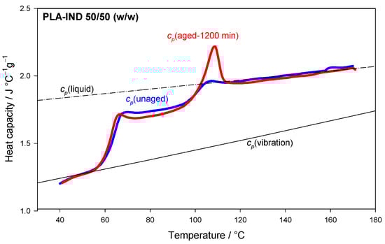 In order to compare the experimental heat capacity of the aged and unaged PLA–IND mixtures, the vibration heat capacity and the liquid heat capacity of examined samples were established. The heat capacity of the solid and liquid was estimated from a sum of linear combinations of the weight fractions of the solid and liquid heat capacity of PLA and IND [35,53]. The vibration of the heat capacity in the solid state of the PLA–IND (wt% 50/50) system, cp(vibration), was estimated by using equation [50]: