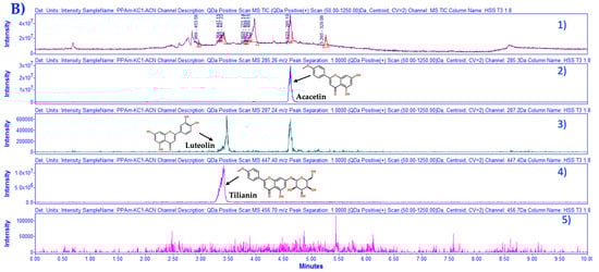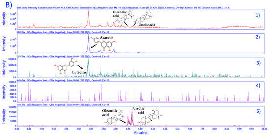 (A) Stack plot for PPAm, (1) TIC with mass scan 50.0–1250 Da and selected channels for identification with 3D chromatogram. Selected channels: (2) 283.26 Da m/z [M−1] for acacetin identification, peak retention time 0.718, (3) 285.24 Da m/z [M−1] for luteolin identification, peak retention time 0.521, (4) 455.7 Da m/z [M−1] for oleanolic acid and ursolic acid, peak retention time 2.27 and 2.35, respectively. Acquired in negative mode [ESI−] isocratic elution. (B) Stack plot for PPAm (1) TIC and selected channels from mass scan at (2) 283.26 Da m/z [M−1] for acacetin identification, peak retention time 2.87 (3) 285.24 Da m/z [M−1] for luteolin identification, peak retention time 2.81, (4) 447.40 Da m/z [M−1] for tilianin peak retention time not identified. (5) Oleanolic acid and ursolic acid, peak retention time 4.5 and 4.65. Chromatograms acquired in negative mode [ESI−] gradient elution, the x-axis represents time, and the y-axis represents signal intensity. Column ACQUITY UPLC® HSS T3 130 Å (1.8 µm, 2.1 × 100 mm).